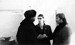 В «центре» за столом расселась вся хебра педагогических дебилок. Место во главе занял пан директор, а многочисленные бумажки ему подавала жена. Из общей атмосферы бюрократической тупости выбиваются некоторые лица напротив: Ольга, Хил, Фур, Ирка Горбачёва + Гармаев, непонятно, каким ветром сюда занесённый. И даже наш приятель Кирилл Федорович (2), психиатр с Кропоткинской, друг СМОГов (3) и анархистов. Впрочем, он бывал и на вечере утопистов, и на мухоморской выставке. Заинтересовался.